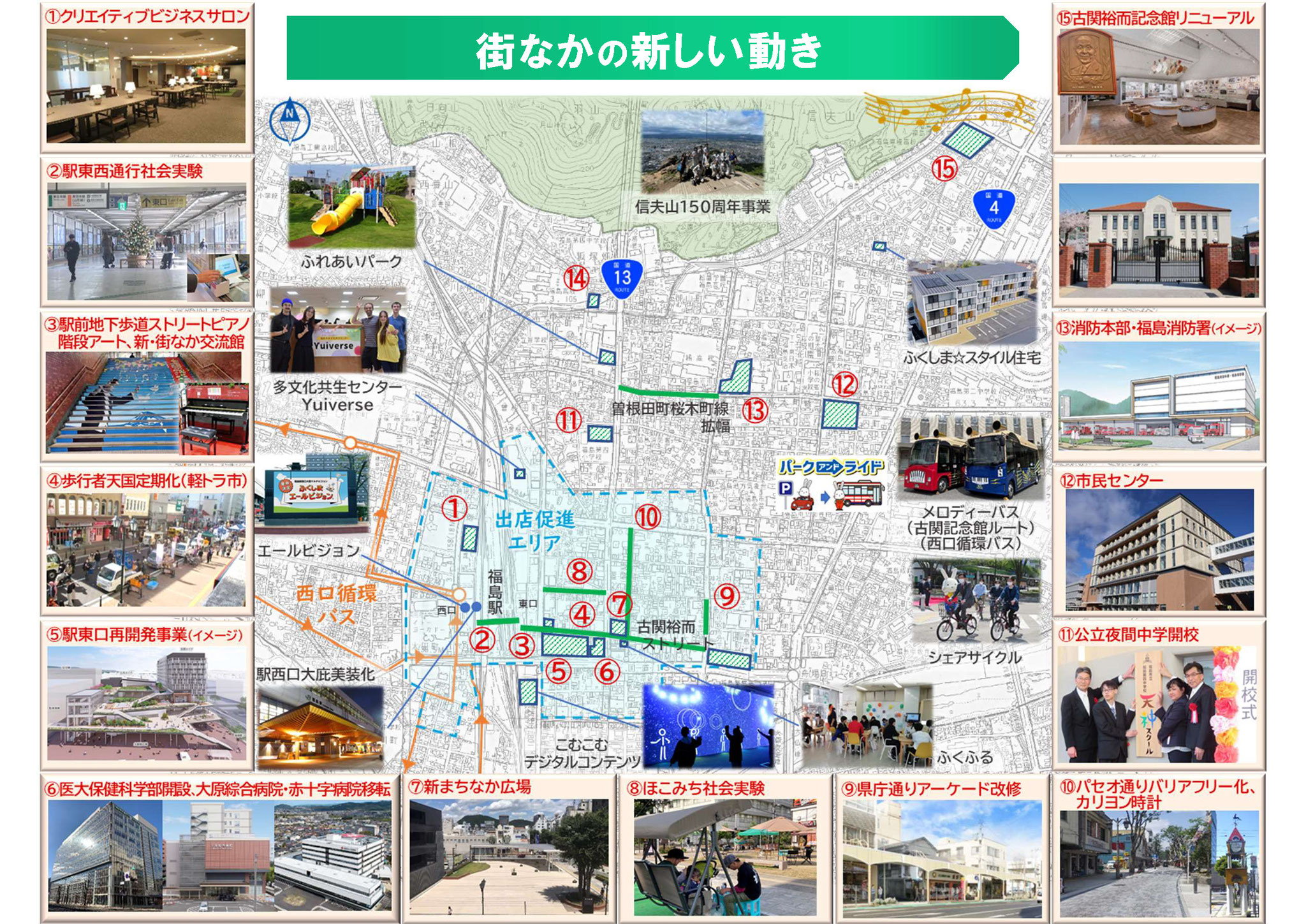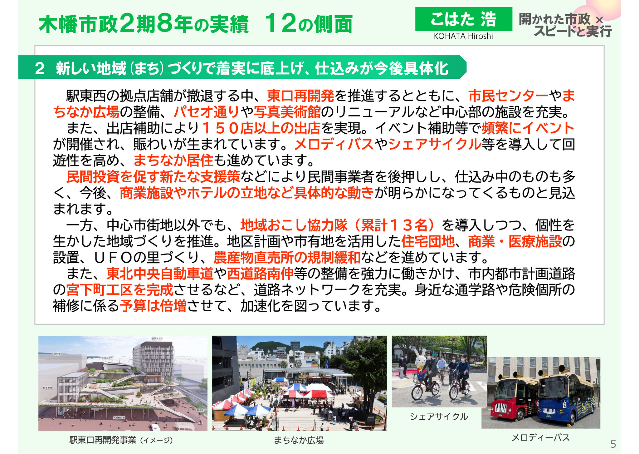 東口再開発を推進、市民センターやまちなか広場など中心部の施設を充実