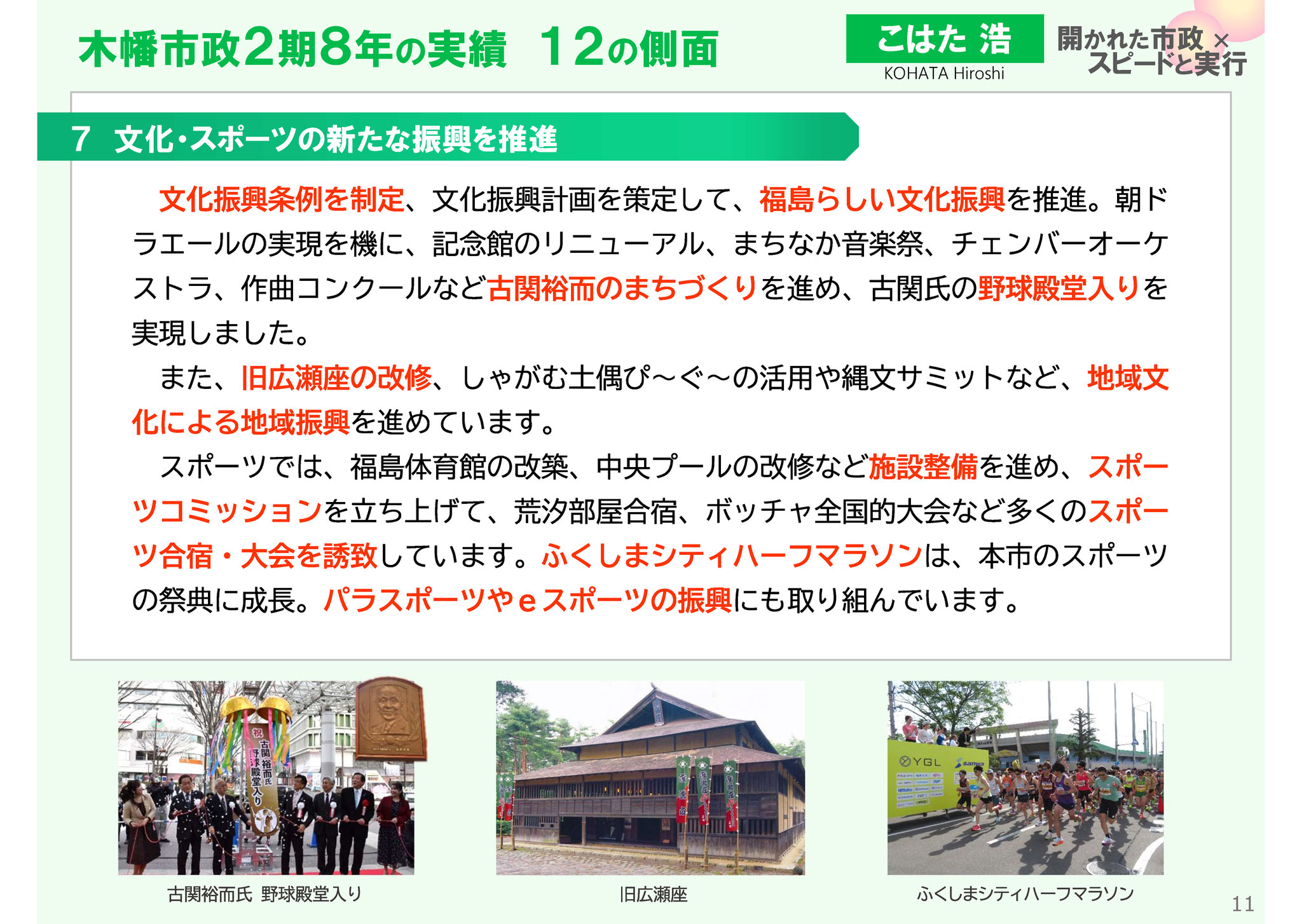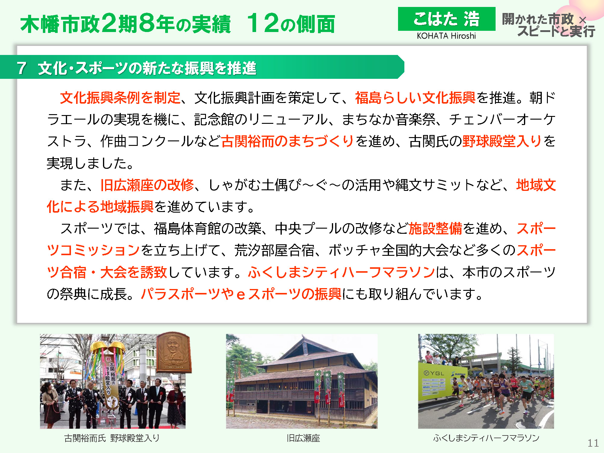 文化振興条例を制定、地域文化による振興(旧広瀬座の改修、しゃがむ土偶の活用など)