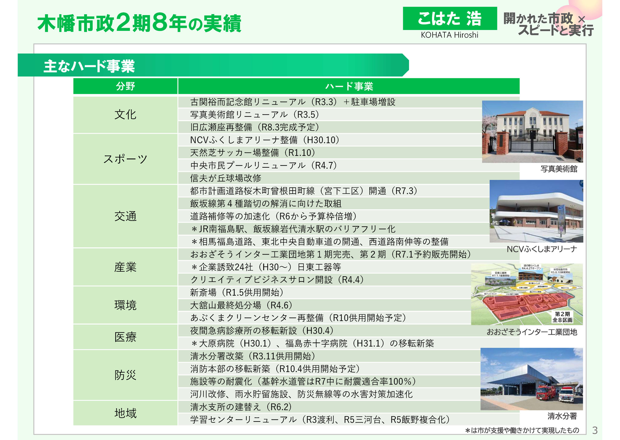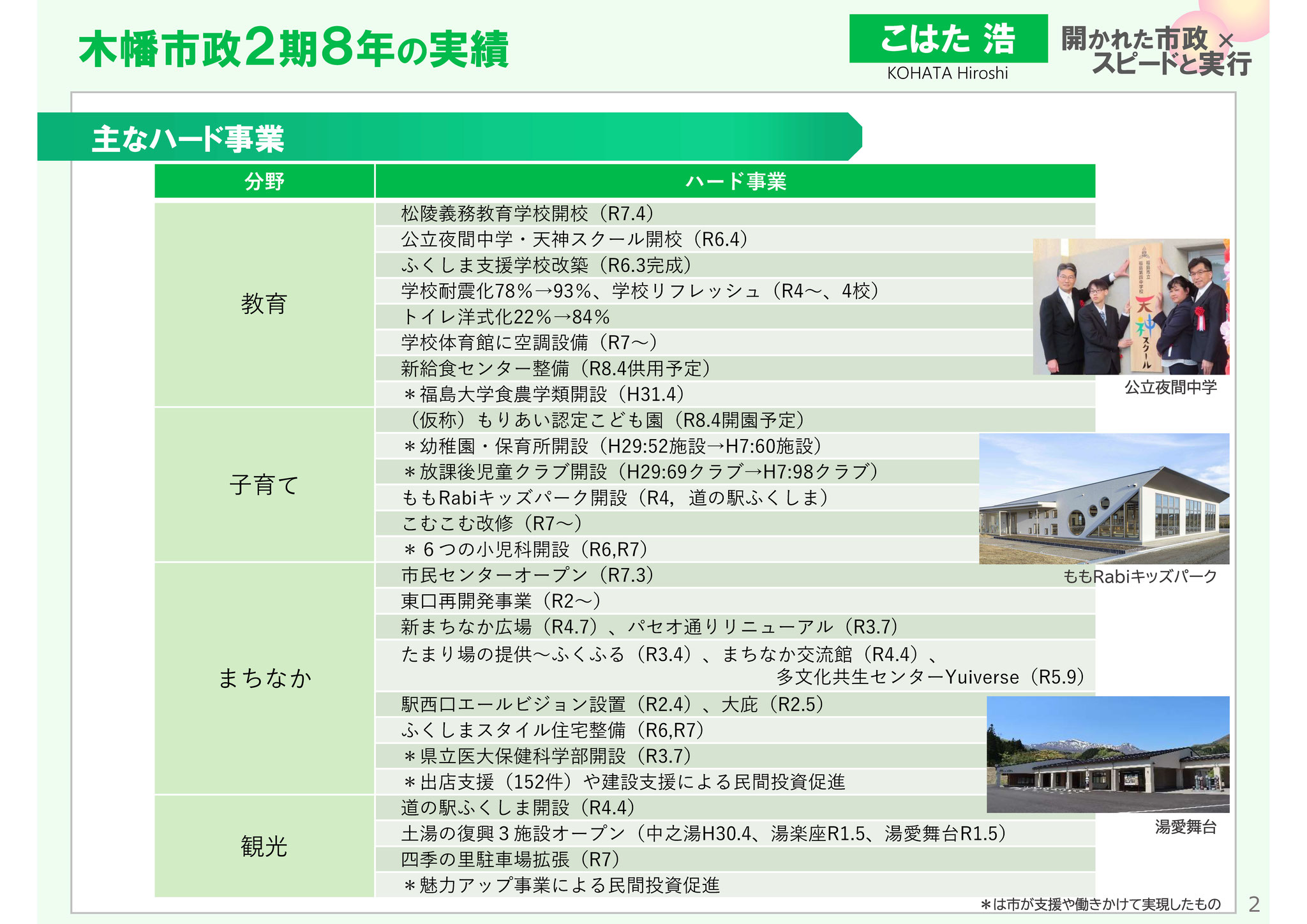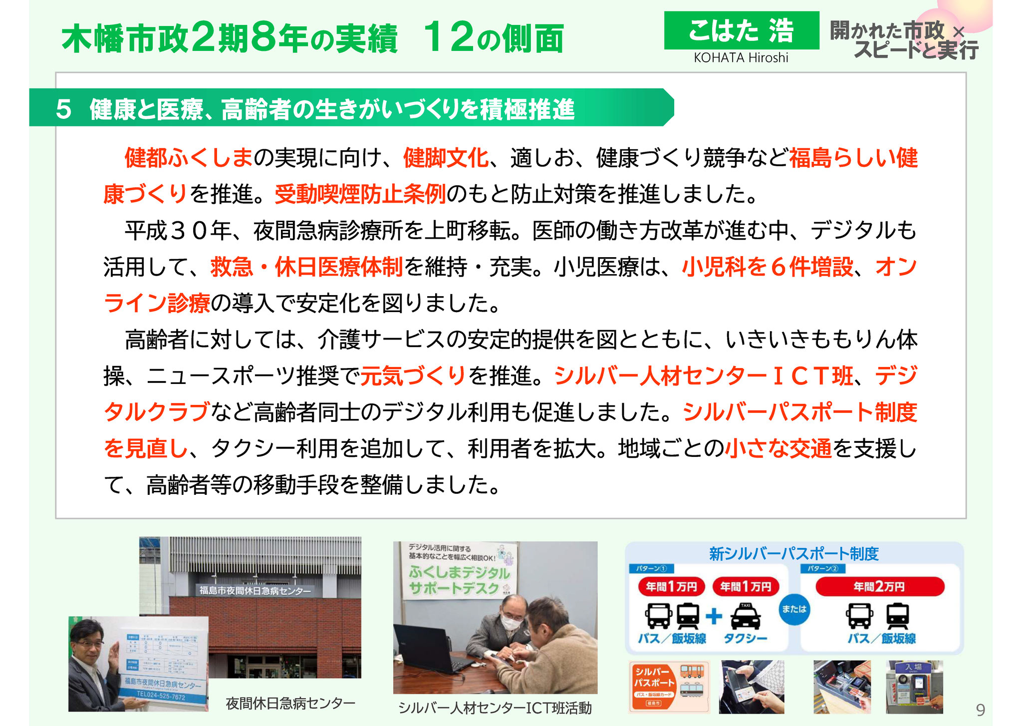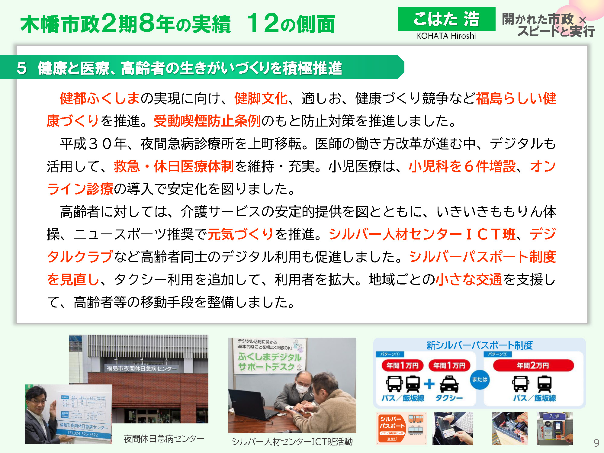 健脚文化、適しおなど福島らしい健康づくり、受動喫煙防止条例の制定と対策推進