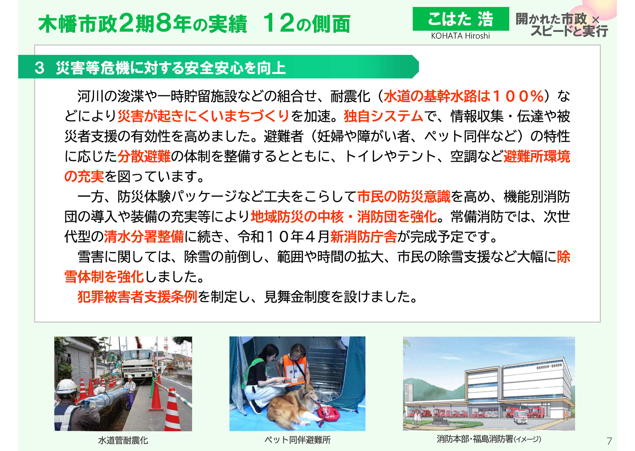 災害が起きにくいまちづくりを加速~耐震化(水道の基幹水路は100%)など